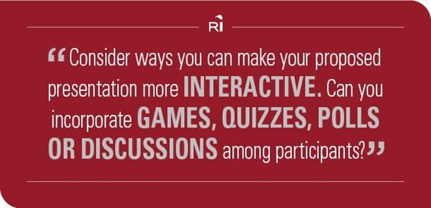 Consider ways you can make your proposed presentation more interactive. Can you incorporate games, quizzes, polls or discussions among participants?