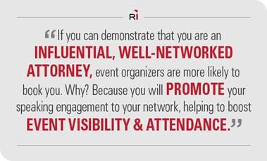 Do you hold a leadership position in an influential organization? Do you have a large number of LinkedIn connections or Twitter followers? What about a targeted email list of engaged subscribers? If you can demonstrate that you are an influential, well-networked attorney, event organizers are more likely to book you. Why? Because you will promote your speaking engagement to your network, helping to boost event visibility and attendance.
