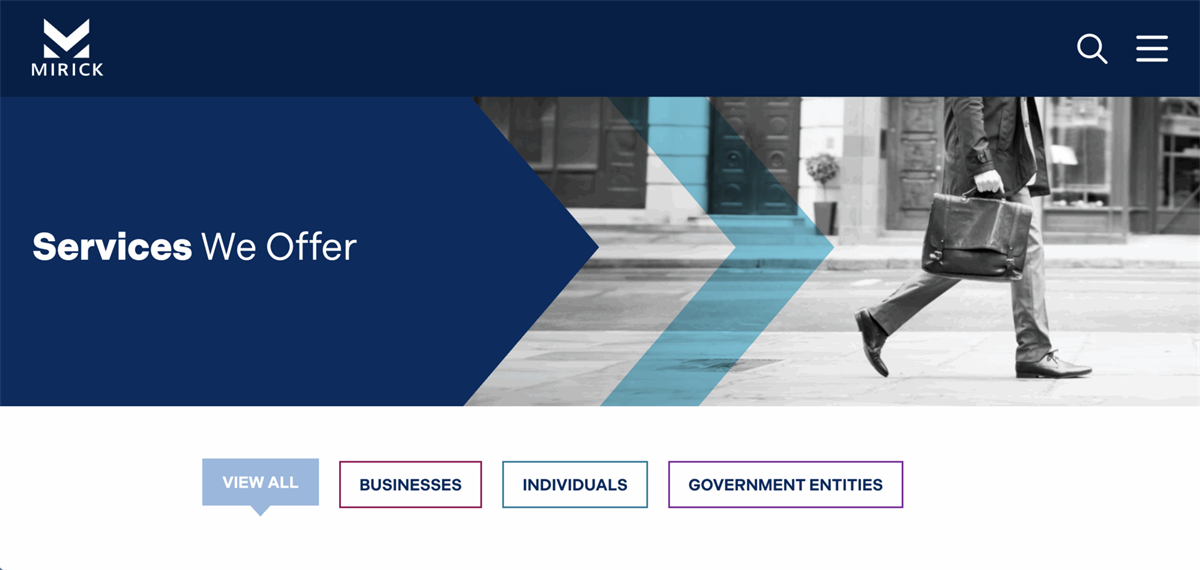 Giving users the ability to search and filter your content keeps visitors engaged and reduces frustration. If your firm has more than twenty practice areas, searching or filtering is especially helpful. On the Mirick Services page, visitors can filter to find services specific to their needs: Businesses, Individuals, or Government Entities.