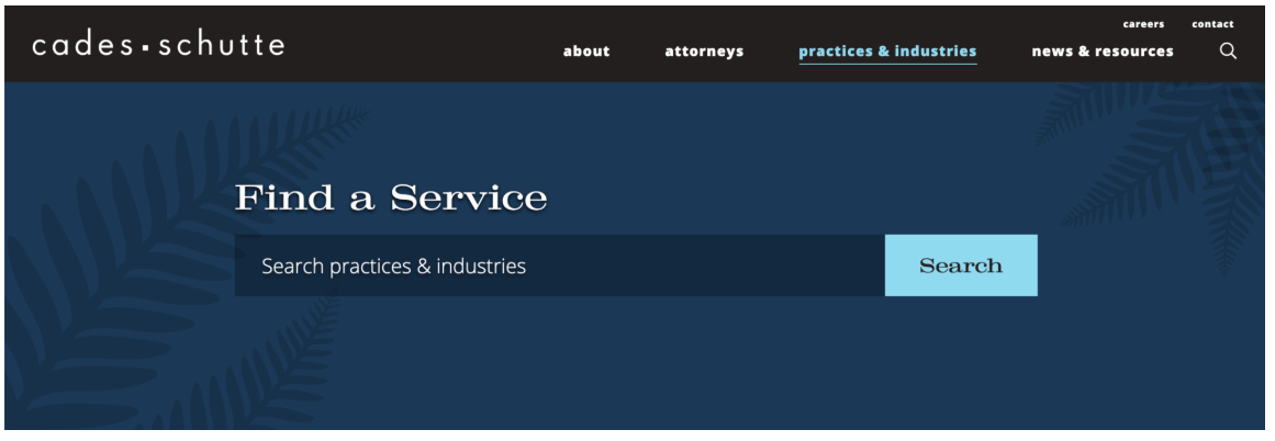 Combining practices and industries into one section is often a good way to streamline content (especially if you have similar content in a practice and industry sections of your site). When everything is in one grouping, attorneys are generally more willing to remove duplicates. Cades Schutte has a lengthy list of services, but combines them on a Practices & Industries landing page. Note that the list is shown categorized, but can be clicked to expand to a full, alphabetical view. Site visitors are encouraged to search for exactly what they are looking for at the top of the page.