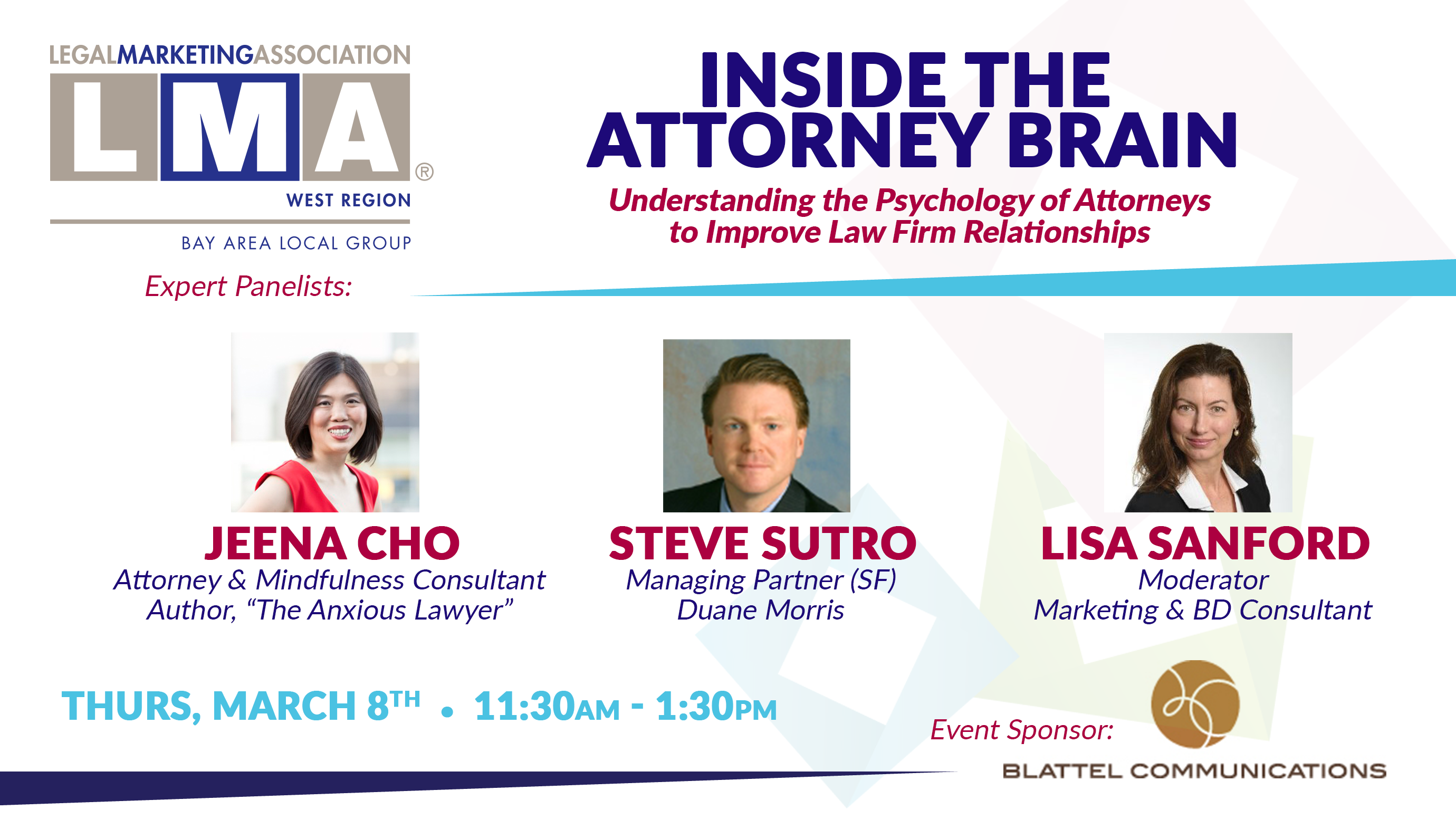 On March 8th, join us for a panel presentation that will travel inside the attorney brain. Our panel features distinguished attorney & author Jeena Cho and managing partner Steve Sutro, who will provide insights from all angles about better understanding and connecting with attorneys on an emotion, psychological, and mental level. Our moderator is Lisa Sanford, Business Development Consultant.