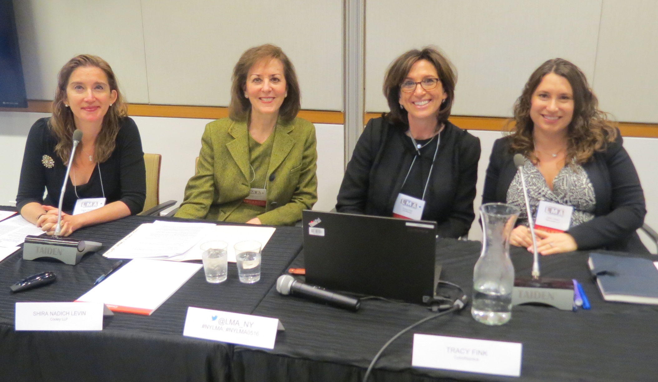 Ms. Levin, who chairs the Cooley Women's Initiative, made her comments at NYLMA’s May 18 luncheon, “Women’s Initiatives: From Professional Development to Business Development.” She was a featured panelist along with Julie Cohen, Marketing Director at Sidley Austin LLP and Tracy Fink, Director of CohnReznick’s Executive Women’s Forum. Diane Costigan, partner at SLJ Shannon, LLC, a legal talent management consultancy, moderated the session, which was hosted by Cooley LLP.