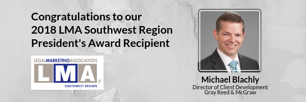 Michael Blachly, Director of Client Development at Gray Reed & McGraw and current Immediate Past-President of the LMA Southwest Region, received the inaugural LMA Southwest Region President’s Award this year at the LMA Southwest Region Conference. The award was created by 2018 LMA Southwest Region President Jessica Jaramillo to recognize significant service and leadership to the LMA Southwest Region that helped to advance the Region goals and serve all region members.